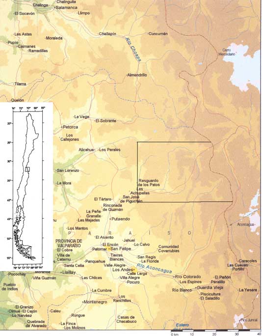 La vegetación de la cordillera de los Patos, Andes de Chile central.: carta del área de estudio (cortesía Atlas Encarta). En los recuadros se muestra el área explorada.
