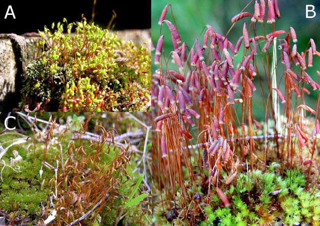 Musgos de la estación biológica Senda Darwin: A. Bryum argenteumB. B. pseudotriquetrumC. B. billarderi Foto. J. Larraín.