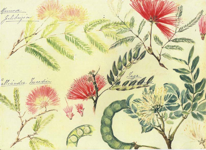 Mimosaceae: Albizzia julibrissin (arriba, izquierda), Calliandra selloi (abajo, izquierda); Calliandra tweedii, arriba, derecha; Pithecelobium sp. (abajo, derecha).