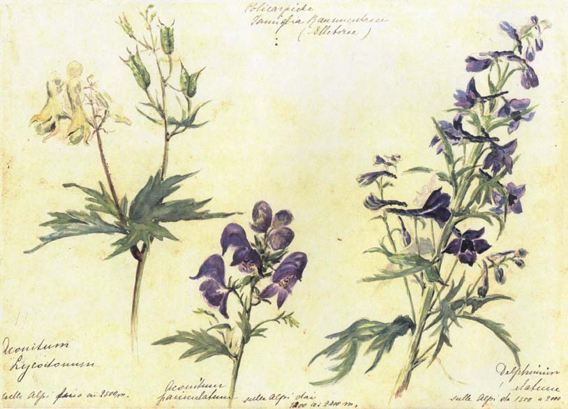 Ranunculaceae: Aconitum vulparia (A. lycoctonum, izquierda); Aconitum paniculatum (al medio) Delphinium elatum (derecha).