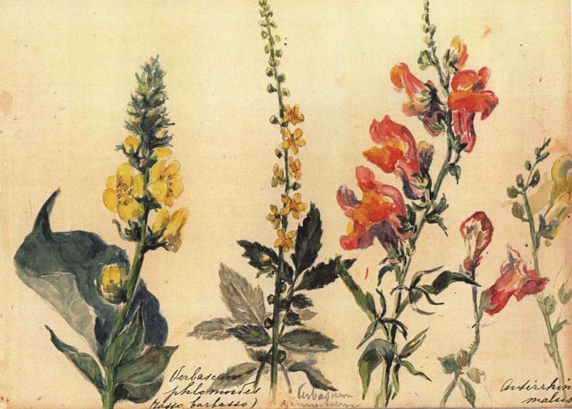 Scrophulariaceae: Verbascum phlomoides (izquierda); Verbascum sinuatum (centro), Antirrhinum majus (derecha).
