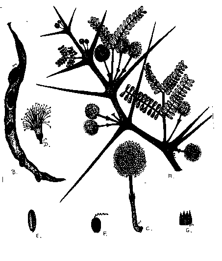 Figura 15. Acacia karoo Hayne; A. Rama florífera (x 1); B. Fruto (x 1); C. Inflorescencia (x 5); D. Flor (x 10); E. Folíolo (x 2); F. Semilla (x 1); G. Bráctea (x 2).