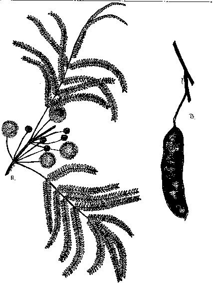 Figura 20. Acacia visco Lor. ap. Griseb. A. Rama florífera (x 0.5); B. Fruto.