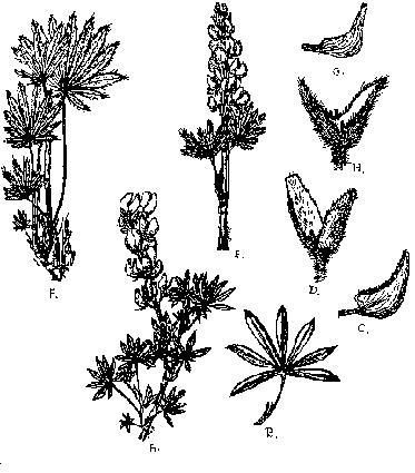 Figura 31. Lupinus arboreus Sims.; A.Rama florífera (x 0.5); B. Hoja (x 0.5); C. Quilla (x 1); D. Cáliz (x 2); Lupinus polyphyllus Lindl.; E. Rama florífera (x 0.5); F. Hojas (x 0.5); G. Quilla (x 1); H. Cáliz (x 2).