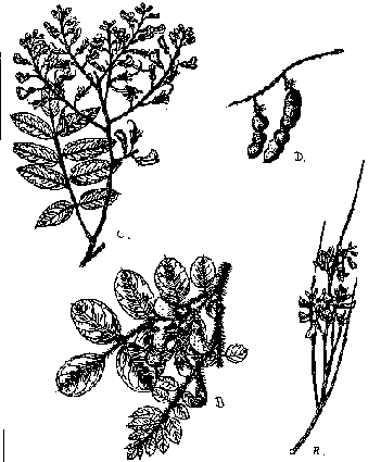Figura 35: Retama monosperma (L.) Bois; A. Rama florífera (x 0.5); Robinia hispida L.; B. Rama florífera (x 0.5); Sophora japonica L.; C. Rama florífera (x 0.5); D. Fruto (x 0.5).