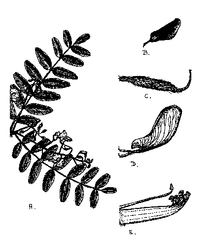 Figura 42: Tipuana tipu (Benth.) O. Kuntze; A. Rama florífera (x 0.5);B. Fruto (x 0.5); C. Gineceo (x 4.5); D. Quilla (x 4.5), E. Androceo (x 4.5).
