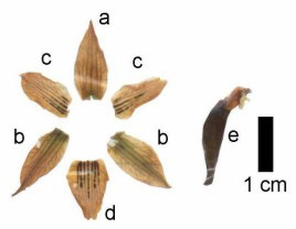 a. tépalo externo, superior ("sépalo" superior). b.