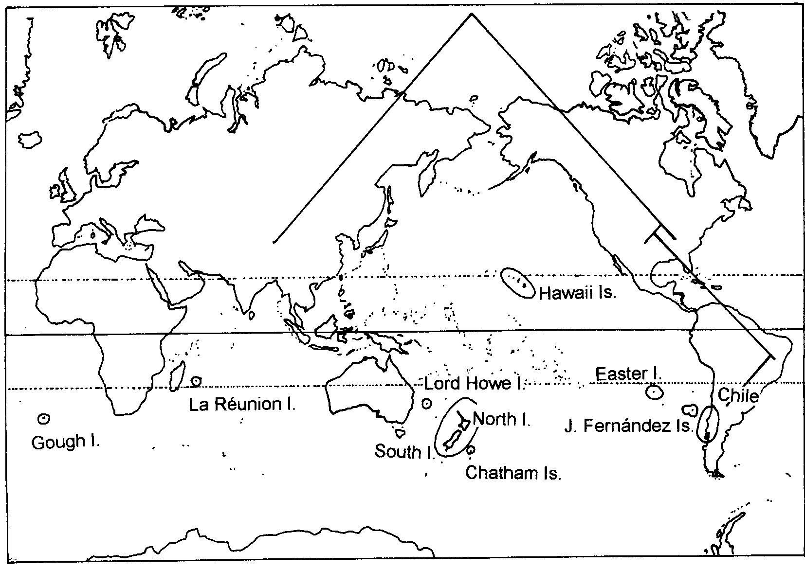 Figura 2: Cladograma de área de algunos representantes de Sophora. El cladograma muestra los elementos sudamericanos derivados de linajes del hemisferio Norte, Styphnolobium y Calia.