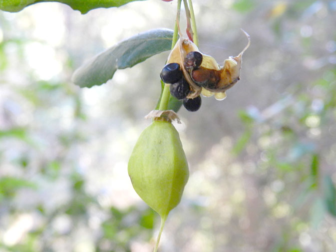 Crinodendron patagua (Elaeocarpaceae). Al centro un fruto inmaduro,