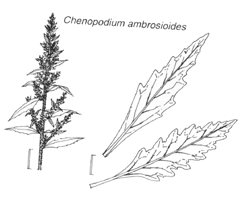 Chenopodium ambrosioides: Inflorescencia, variabilidad de las hojas.