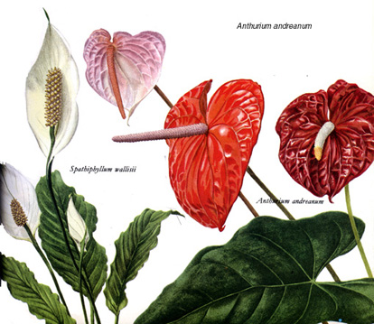 Araceae: Anthurium andreanum y Spatiphyllum wallisii. Especies ornamentales, de interior.