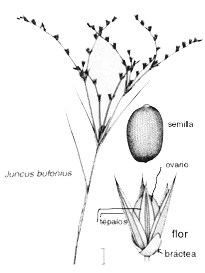 Juncaceae: Juncus bufonius. Inflorescencia y flor, esquemas.