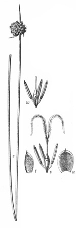 Planta áfila, tallo de sección triangular, inflorecescencia condensada