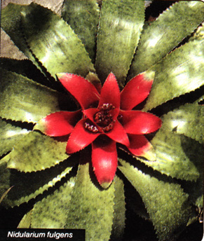 Bromeliaceae: Nidularium fulgens, planta ornamental. De cultivo en interior.