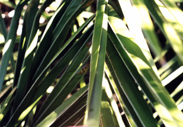 Arecaceae: Jubaea chilensis, segmentos de una hoja, mostrando la forma de canal invertido.