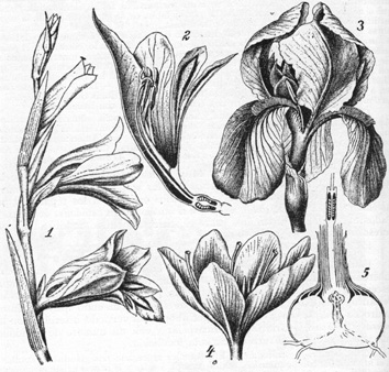 1. Gladiolus sp., inflorescencia cimosa (monocasio). 2. Id. flor en