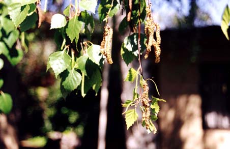 Betulaceae: Betula pendula, inflorescencias masculinas y hojas.