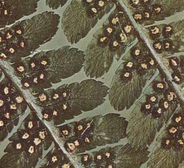 Helechos: soros con indusio (plaquitas circulares, amarillentas)