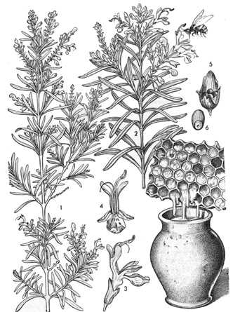 Rosmarinus officinalis (Lamiaceae): arbusto aromático, utilizado como planta melífera. |