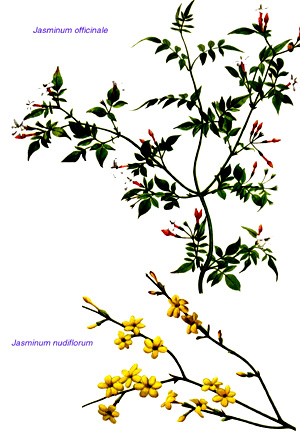 Oleaceae: Jasminum spp., jazmines. Arbustos usados como ornamentales en Chile.