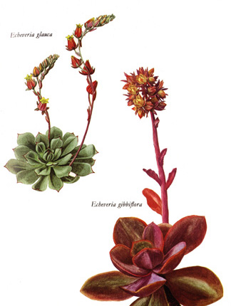 Izq. Echeveria glauca; centro: Echeveria gibbiflora;