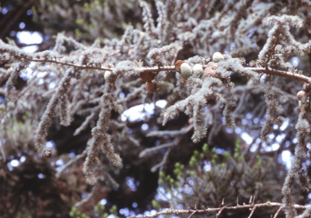 Pinaceae: Cedrus atlantica, ramas con ginostróbilos erectos.