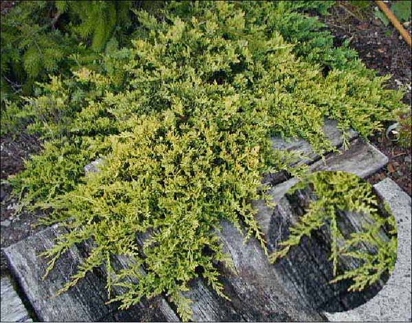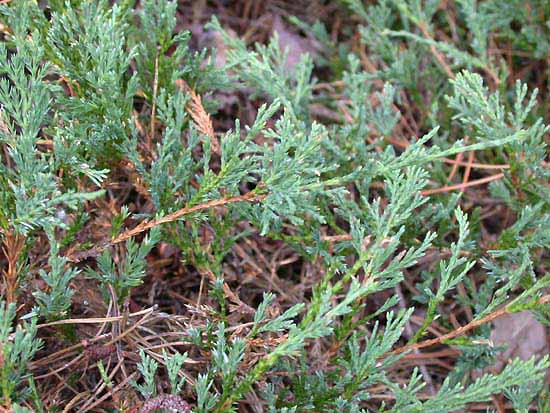Juniperus horizontalis: arbusto con crecimiento postrado. Hojas aciculares.En Chile, ornamental.