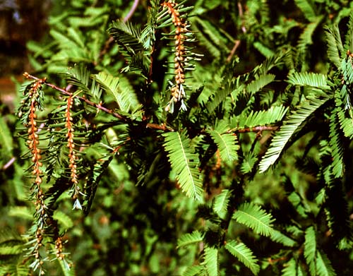 Metasequoia glyptostroboides (Taxodiaceae): rama con hojas. A la izquierda estróbilos masculinos; a la derecha, ginostróbilos.