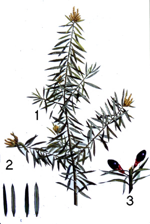 1. Rama con androstróbilos terminales. 2. Hojas linear-aplanadas, ápice