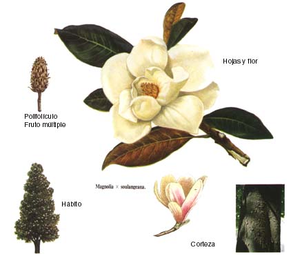 Abajo, al centro, flor de M. x soulangiana, arbusto de origen