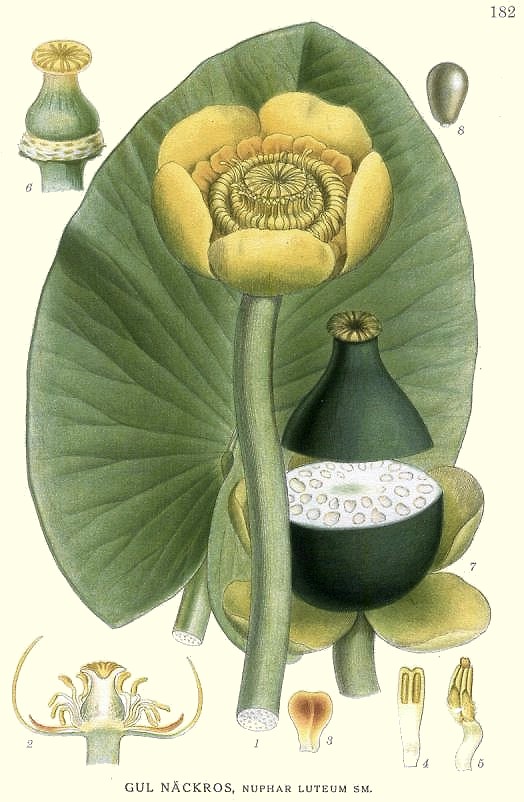 Nuphar luteus: esquema de las partes de una planta.