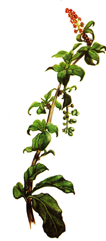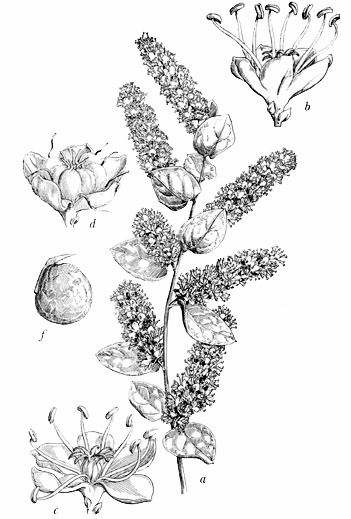 Phytolaccaceae: Ercilla spicata, especie nativa. Arbusto lianoide. a. rama florida. b. Flor. c. Flor mostrando el interior. d. Flor con el gineceo multicarpelar, apocárpico. f. Carpelo.