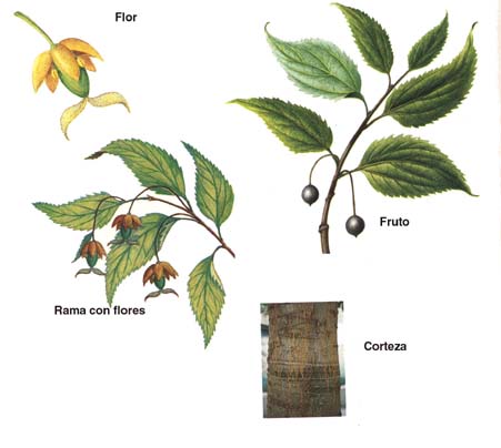 G. Ulmus laevis, hoja; . H. U. laevis, fruto. I. Ulmus parviflora,