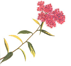 Rosaceae-Spiraeoideae: Spiraea x bumalda, arbusto ornamental.