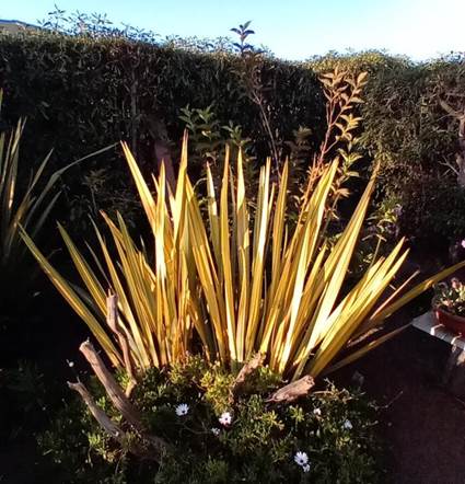 Phormium tenax en Chile. Cultivar con hojas amarillas.