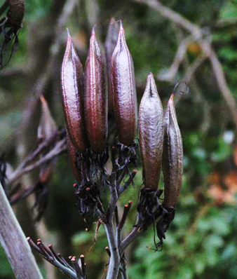 tres carpelos unidos. Fruto, una cápsula trígona, de 5-10 cm de long., verde