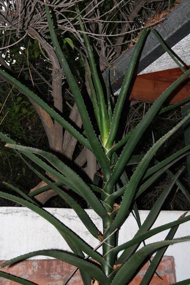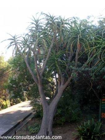 Descripción: planta suculenta de porte arbóreo, de 15 a 18 m de alto, fuertemente pseudodicotómica, corteza de gris. Hojas en rosetas terminales en las ramas, de color verde opaco, de 60-90 x 7-9 cm de ancho en la base, ensiformes, margen dentado de color claro rojizo. Inflorescencia de 40 a 60 cm de altura, ramificada en tres. Flores tubulares de 3 cm long., con seis tépalos petaloides unidos, rosa-anaranjados con el ápice verdoso: androceo con seis estambres, estilo ligeramente exerto, ovario súpero. Fruto, una cápsula con numerosas semillas.