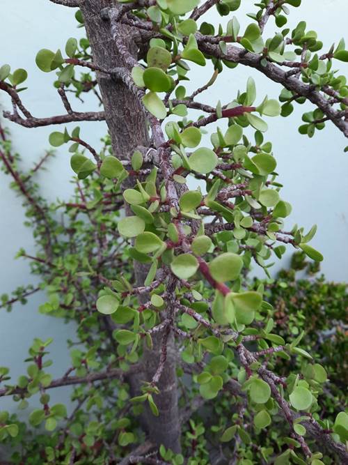 Portulacaria afra en Chile. Detalle de las hojas suculentas.