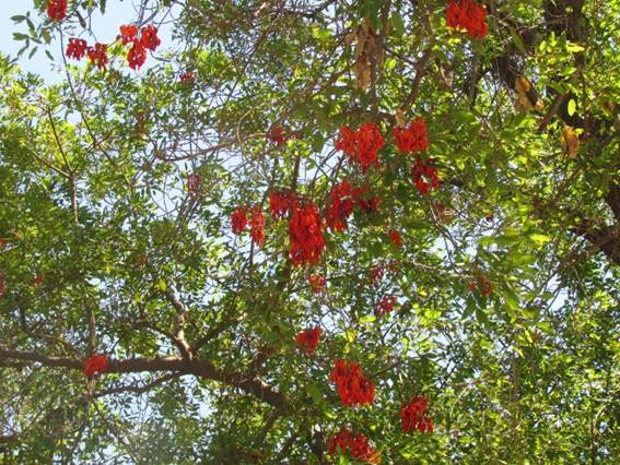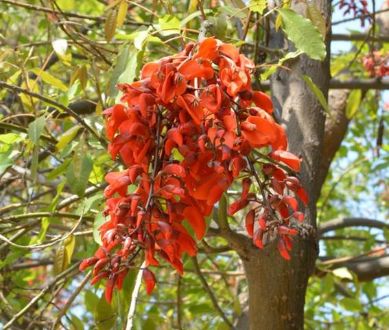 Descripción: árbol de 10-20 m de alto, tronco corto y más o menos erecto de hasta unos 150 cm de diámetro; corteza pardo-grisácea y finamente agrietada, pero en las ramillas es lisa y con lenticelas horizontales; copa muy amplia, globosa, irregular, formada por ramas gruesas, extendidas y quebradizas. Hojas verde-brillantes, glabras, caducas o subpersistentes, alternas, pinnaticompuestas, formadas por tres folíolos subcoriáceos, de 10-20 cm, anchamente elipsoidales, el terminal + oval, ápice y base agudos, enteros y ondulados, nervadura pinnada; estípulas pequeñas y persistentes; los folíolos llevan a veces un aguijón blando que sale del nervio medio (en Santiago los ejemplares estudiados no lo presentan), y dos nectarios extraflorales en la inserción de cada folíolo. Flores vistosas, dispuestas en densos y grandes racimos péndulos que aparecen antes que las hojas; flores rojo-escarlatas, sin aroma; cáliz gamosépalo, notoriamente campanulado, truncado, de 7-20 x 11-18 mm, entero o bilobulado (o lacerado en algunos casos); corola con estandarte, elíptico-aovado, de 2,8-4 (5,5) cm , alas muy reducidas, dentadas en la base, de 7-14 mm , quilla de 30-47 mm; estambres desiguales unidos parcialmente por sus filamentos; ovario súpero, unicarpelar, estipitado, multiovulado, estilo glabro, estigma capitado. Fruto, una legumbre fusiforme y comprimida de 7-12 x 2,5 cm; semillas aplanadas, redondeadas de hasta 2 cm de diámetro.