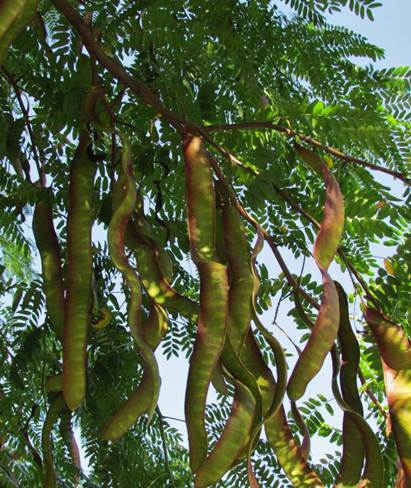 Descripción: árbol de 8-12 a 20 m de alto, con tronco recto de hasta 60 cm de diámetro, corteza pardo-grisácea, lisa cuando joven, fisurada y con escamas angostas al envejecer; copa globoso-deprimida y ancha u oblonga con ramas extendidas o divergentes provistas, como el tronco, con espinas de 5-10 cm, simples o, más a menudo, ramificadas en tres. Hojas caducas en invierno, alternas, pinnati o bipinnaticompuestas, las pinnadas compuestas por 7-19 pares de folíolos, mientras que las bipinnadas con 4-9 pares; folíolos subglabros, verde-claro, de 1-3 x 0,7-1,0 (2-3,5) cm, oblongo-lanceolados, elípticos u ovales, enteros o apenas crenado-serrulados. Flores en racimos péndulos, axilares, densos, pubescentes, de 4-12 cm, los femeninos o hermafroditas con menos flores que los masculinos; especie polígamo-dioica o monoica, flores inaparentes, blanco-verdosas, con un receptáculo turbinado, cortamente pediceladas.; cáliz de 5-6 sépalos, campanulado, de 0,2-0,5 cm; corola de 4-5 pétalos o nula; las masculinas con 5-11 estambres libres, las femeninas con ovario estrecho, piloso, de 2 mm, estigma peltado, convexo. Fruto, una legumbre lineal-comprimida, pardo oscuro con tinte rojizo, péndula, semipersistente, de 20-40 x 2.5 cm, curvada y retorcida en toda su longitud; semillas elipsoidales u ovales inmersas en el mesocarpio algo pulposo y dulce, pardas a castaño-oscuras, muy duras, lisas, de 0,8 cm.