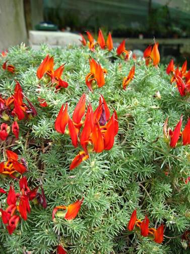 Descripción: subarbusto rastrero o colgante, con ramas flexibles que pueden superar el medio metro de longitud. Hojas compuestas, trifoliadas; foliolos estrechos, aciculares, verde-plateados. Las flores se agrupan en racimos en los extremos de los tallos. Cáliz gamosépalo, tubular con 5 sépalos, la parte libre de los sépalos (“dientes”), breve; corola papilionada con una forma particular curva y puntiaguda, pétalos 5, desiguales, del rojo al naranja; estambres insertos en la quilla de la corola, polinización por insectos; ovario unicarpelar, súpero, con un estilo y un estigma, típico de las leguminosas. El fruto es una legumbre que contiene varias semillas.