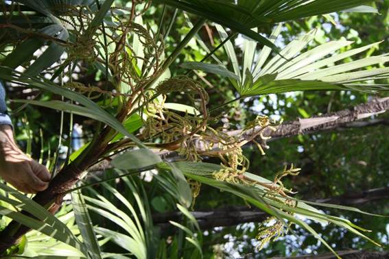Descripción: palmera dioica. Tallos (estipes) erguidos, agrupados, de 90-120 cm de alto, cubiertos por las vainas de hojas persistentes y un material fibroso de color marrón oscuro, que se desprende de las hojas. Hojas con peciolos estrechos, de hasta 60 cm long., lámina de 60-70 cm long., palmaticompuesta, fibrosa, con forma de abanico, con 5-13 segmentos verde-brillantes, dentados en el ápice. Inflorescencia en espádice interfoliar, con una espata que se vuelve coriácea (bráctea) que envuelve a una panoja muy ramificada. Especie dioica. Flores unisexuales, sésiles, amarillas, con forma de cuenco; las masculinas de 6 mm, cáliz trímero, lobulado, dentado, con forma de cúpula, tépalos unidos; androceo con seis estambres dispuestos en dos series; flores femeninas similares, pero de tamaño menor que las masculinas; ovario con tres carpelos, pero solo uno se desarrolla hasta la fructificación. Fruto de 1 cm long., redondeado u ovalado, mesocarpio blando, amarillo claro.