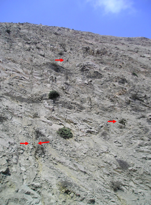 Hallazgo de Malesherbia tocopillana Ricardi (Malesherbiaceae). Hábitat de la planta en la ladera de la tercera quebrada de Tocopilla. Las flechas indican la ubicación de los individuos vivos observados.