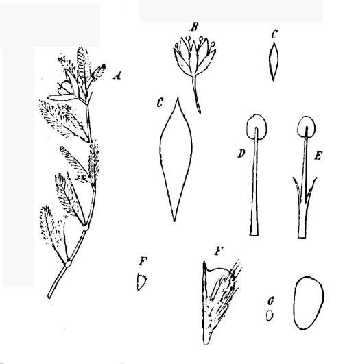Figura 3. A. Detalle de una rama. B.Flor. C. Sépalo. D y E. Estambre. F. Fruto (carpidio), G. Semilla..