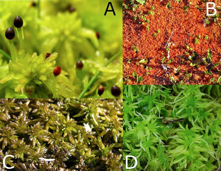 Musgos de la estación biológica Senda Darwin: A. Sphagnum falcatulum. B. S. magellanicum. C. S. subsecundum. D. S. fimbriatum (Fotos: J. Larraín)