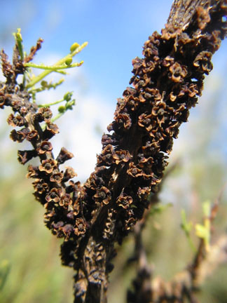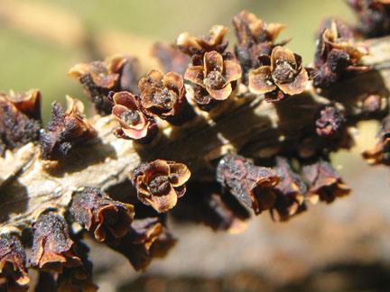 creciendo sobre Adesmia microphylla (Fabaceae). Detalle de las flores.