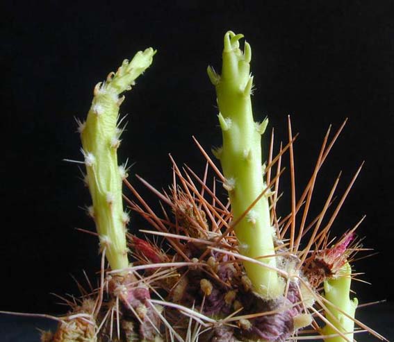 Maihueniopsis nigrispina (Cactaceae) en Chile: Crecimiento de brotes en la muestra de herbario (3.5 x 0.5 cm). Foto: A. Kirberg .