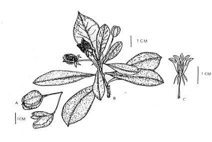 Figura 4. Pittosporum tobira (Thunb.) Ait. Pittosporácea arbustiva cultivada en Chile como ornamental. A: fruto. B. rama. c. Flor.