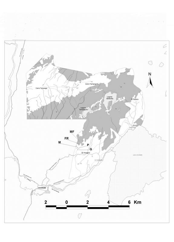 Howorth, R.: Lenga forest regeneration in Chile. Figure 1: Map of RN Lago Cochrane (Tamango) showing the distribution of lenga forest and location of the plot pairs established (letter code labels)