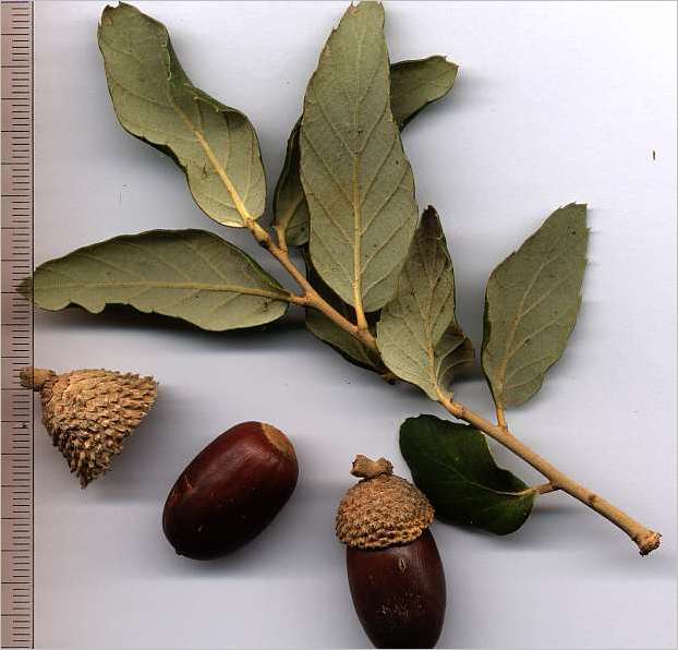 Quercus suber (Fagacaeae). Detalle de las hojas, la cúpula y el fruto (bellota)